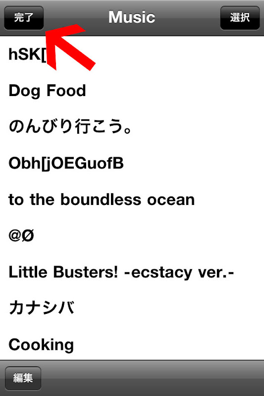 ここで、赤矢印で示したところをタッチすると、見慣れた「iPodの曲リスト」が出てくるので、いろいろ選べ!気分で選べ!元の画面に戻ったら、今度は♪ボタンをタッチ!